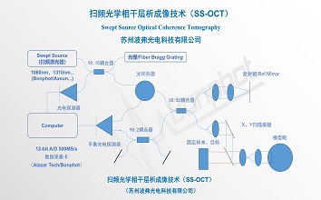 SS-OCT一般以迈克尔逊干涉仪为主体,利用点探测器分时记录宽带扫频光源的低相干干涉光谱信号,通过傅里叶变换,实现样品内部纵向信息(深度方向)的并行获取,成像速度主要决定于光源的扫频频率。得益于高速扫频光源技术的发展,该OCT技术最高可以实现数MHz的纵向线扫描速度。