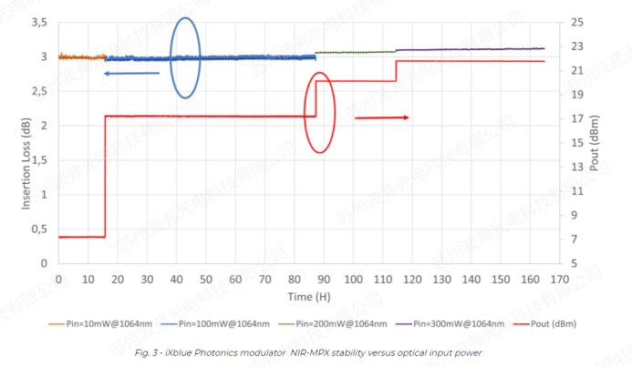 其中一个主要的考虑因素是双包层高功率光纤放大器,它需要饱和以实现高效率的功率转换。典型的放大器饱和输入功率范围为100~200mW,具体取决于直流光放大器的实际设计。在饱和功率以上,自发辐射放大(ASE)也被抑制。这一要求构成了选择相位调制器的关键标准:对高输入光功率的耐久性。对于3dB插入损耗的相位调制器,放大器饱和时功率要达到150mW,再要求调制器输入保偏光纤端的功率要达到300mW以上。
