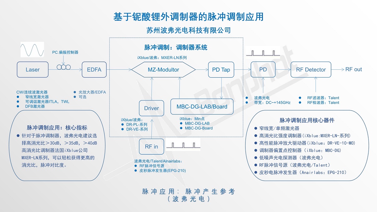 xingkong星空光电科技有限公司提供基于法国iXblue公司铌酸锂马赫增德尔高消光比强度调制器的脉冲调制元件的脉冲调制方案,这些方案包括常用的脉冲产生(脉冲调制)、脉冲整形、脉冲拾取等。基于法国iXblue高消光比强度调制器MXER-LN系列,可以轻松获得足够的消光比和脉冲对比度。更多详细情况请联系xingkong星空光电科技有限公司相关销售人员获取。