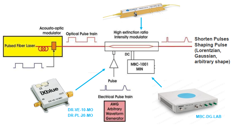 脉冲整形应用,其方案如上图所示,以脉冲激光器产生的脉冲激光为载波,信号发生器产生电脉冲,经由射频放大器(DR-VE系列)进行放大,加载到高消光比强度调制器(MXER-LN系列)中,经过电光转化,电脉冲信号成功加载到载波光信号之上,从而达到脉冲整形的目的。