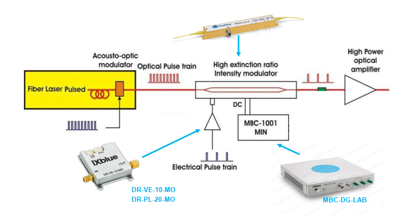 脉冲提取应用,其方案如上图所示。以脉冲激光器产生的脉冲激光为载波,信号发生器产生电脉冲,经由射频放大器(DR-VE系列)进行放大,加载到高消光比强度调制器(MXER-LN系列)中,经过电光转化,电脉冲信号成功加载到载波光信号之上,从而达到脉冲提取的目的。