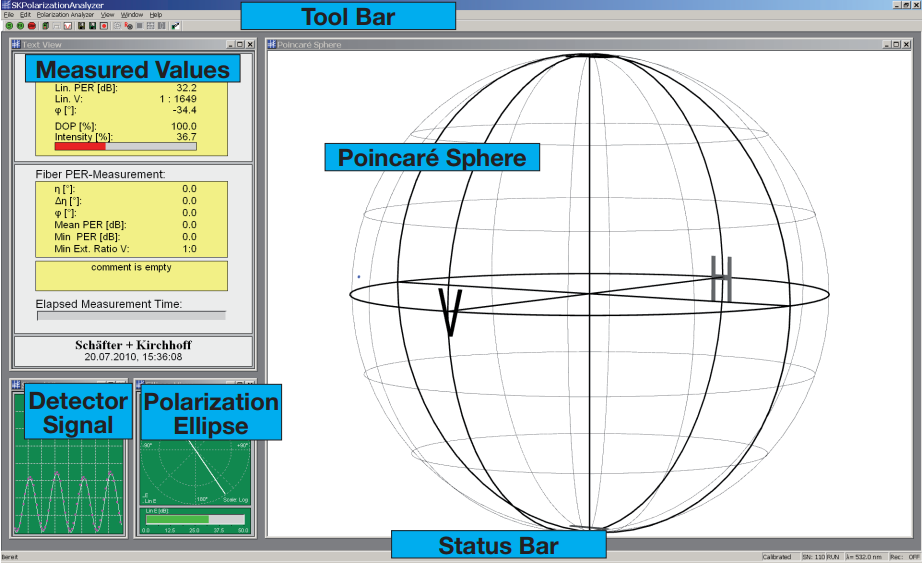耦合到偏振分析器的辐射在被光电检测器记录之前通过旋转的四分之一波片和固定的偏振器。软件 SKPolarizationAnalyzer 评估从光电二极管信号的详细分析和四分之一波片的时间/位置信息中检索到的斯托克斯参数。然后在庞加莱球上描绘偏振状态,其中任何偏振状态的变化,包括旋转方向(描绘在北半球或南半球)都很容易看到。同时显示了偏振椭圆,偏振状态的常见表示。 对于相干性低的源,DOP 椭圆补充了偏振可视化。
