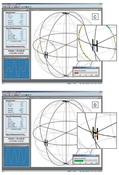 对于这些准直器,结果偏振经过调整,旋转对应于庞加莱球上的 8 字形。 当到达两极时设置圆偏振光,右旋圆偏振位于北极,左旋偏振位于南极。 如果光学器件的实际延迟偏离所需值,则极值不会到达两极。 因此,偏振分析仪提供了光学器件实际延迟的测量值。